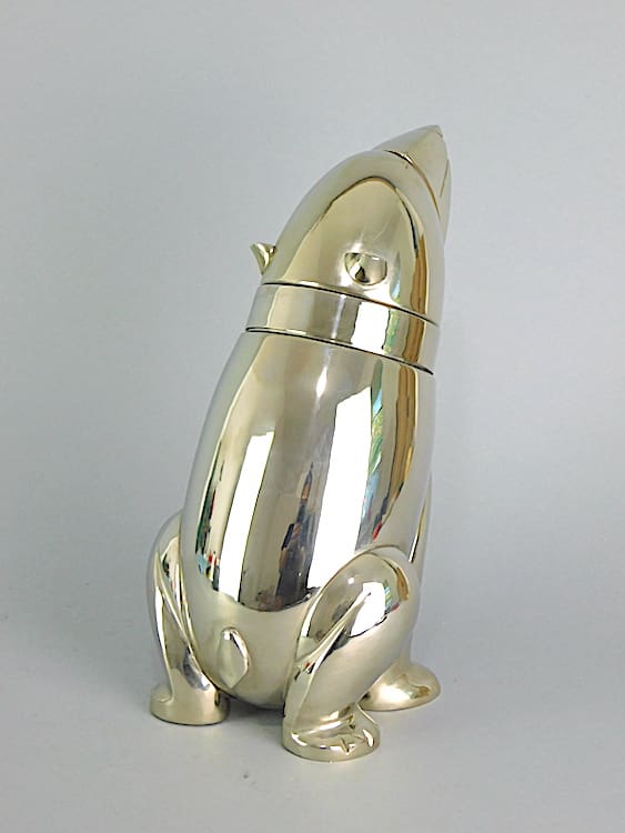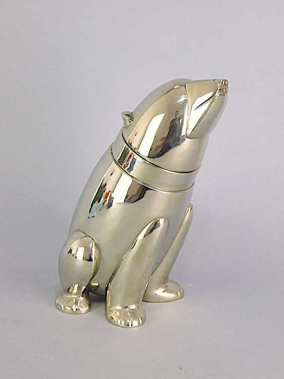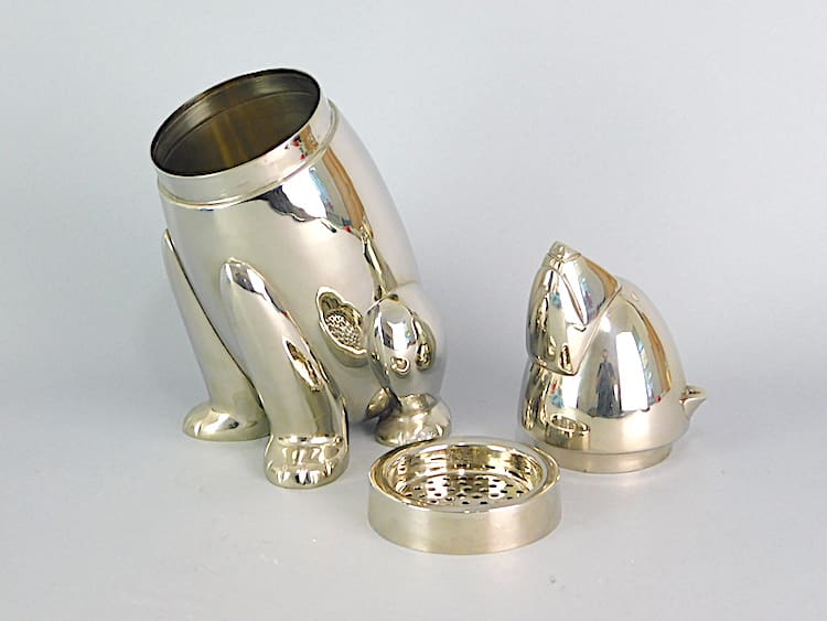 Large chromed metal polar bear cocktail shaker. Three pieces – head and base and an inner filter section collar.