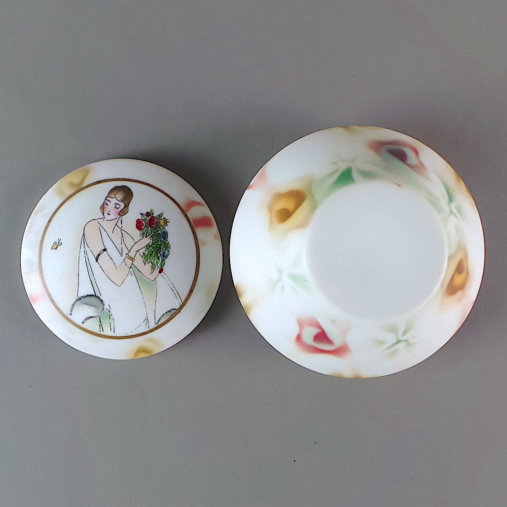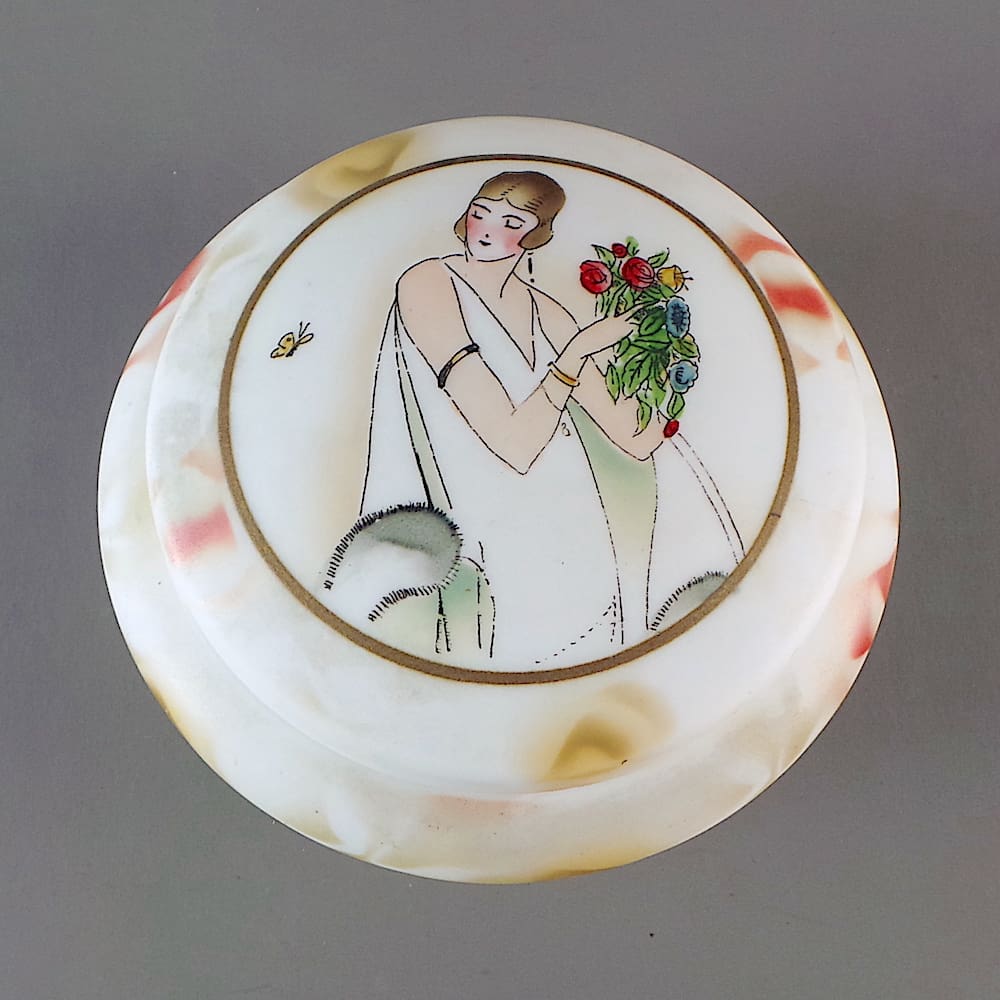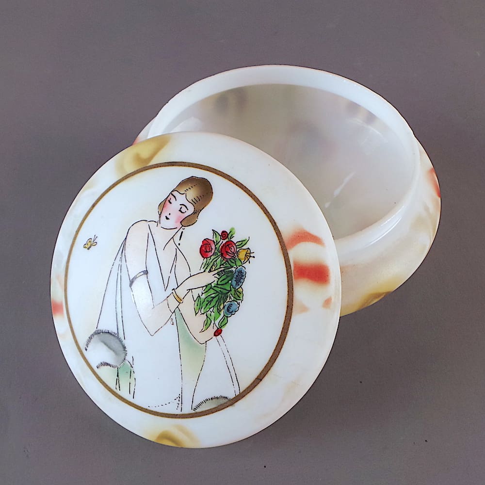 French white glass hand painted Art Deco powder bowl with a flapper holding flowers to the lid.