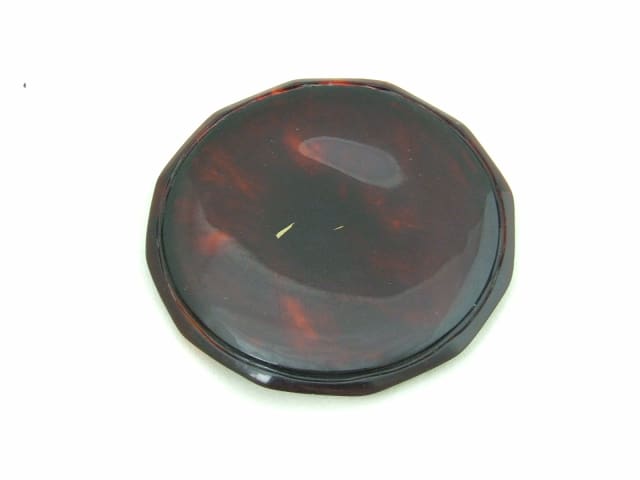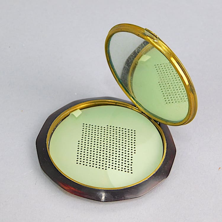 A French phenolic art deco powder compact with woman’s head to the lid, gold and silver leaf. Inside is a mirror to the lid and phenolic sifter panel.