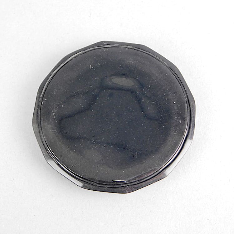 French phenolic art deco powder compact with a flapper to the lid in gold and silver leaf. Inside is a mirror to the lid and phenolic sifter panel.