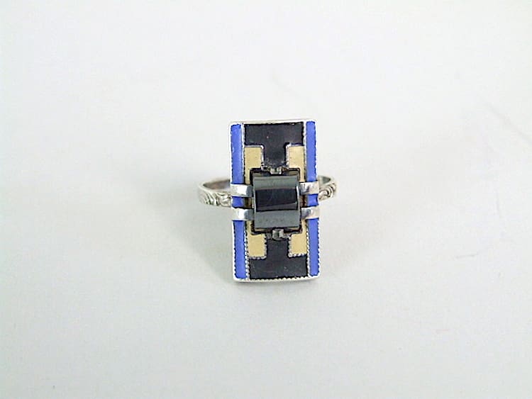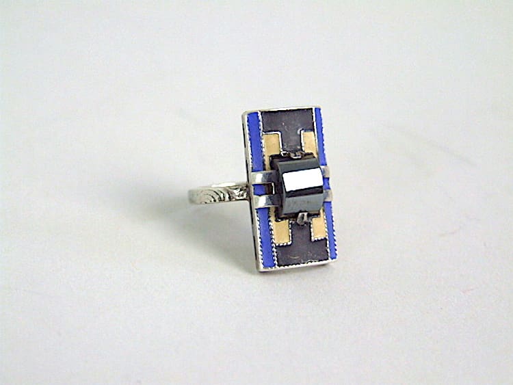 Silver art deco ring with cream, black and blue enamel and central hematite stone. Unsigned but definitely by Theodore Fahrner and dates to the 1920s.