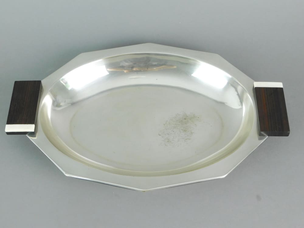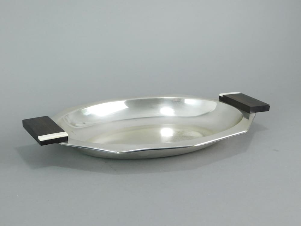 A French silvered oval dish bowl with macassar and ivory handles. Bears a hallmark stamp.