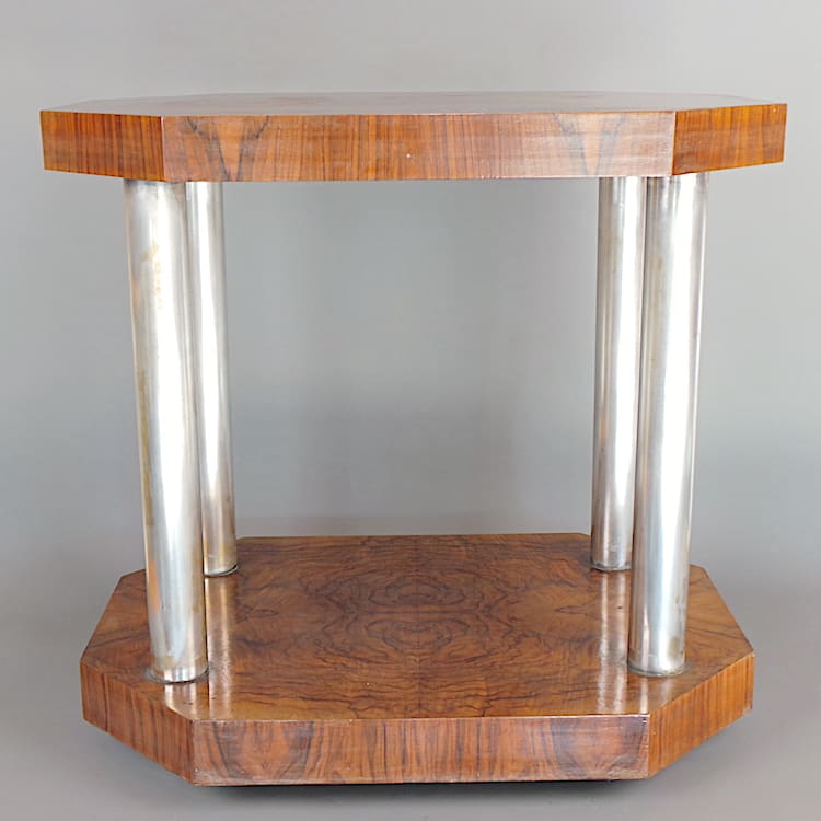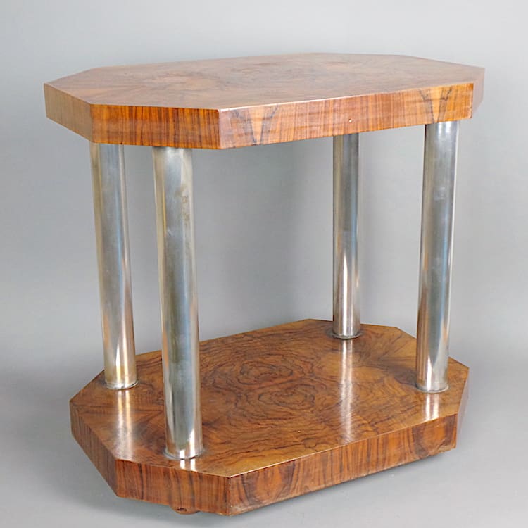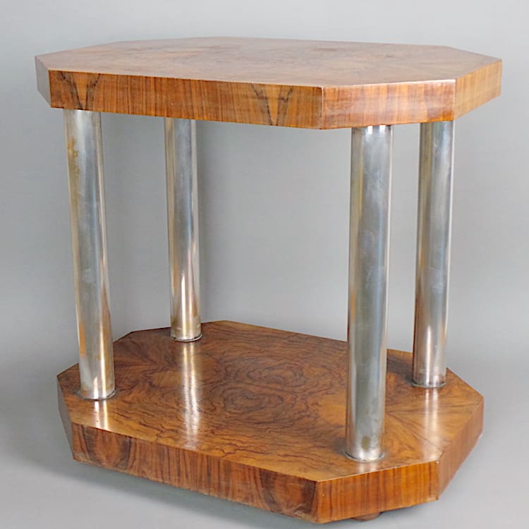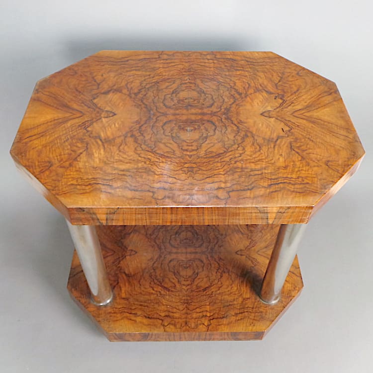 A fine French modernist art deco flame walnut side table with chromed metal tube leg supports and canted corners.