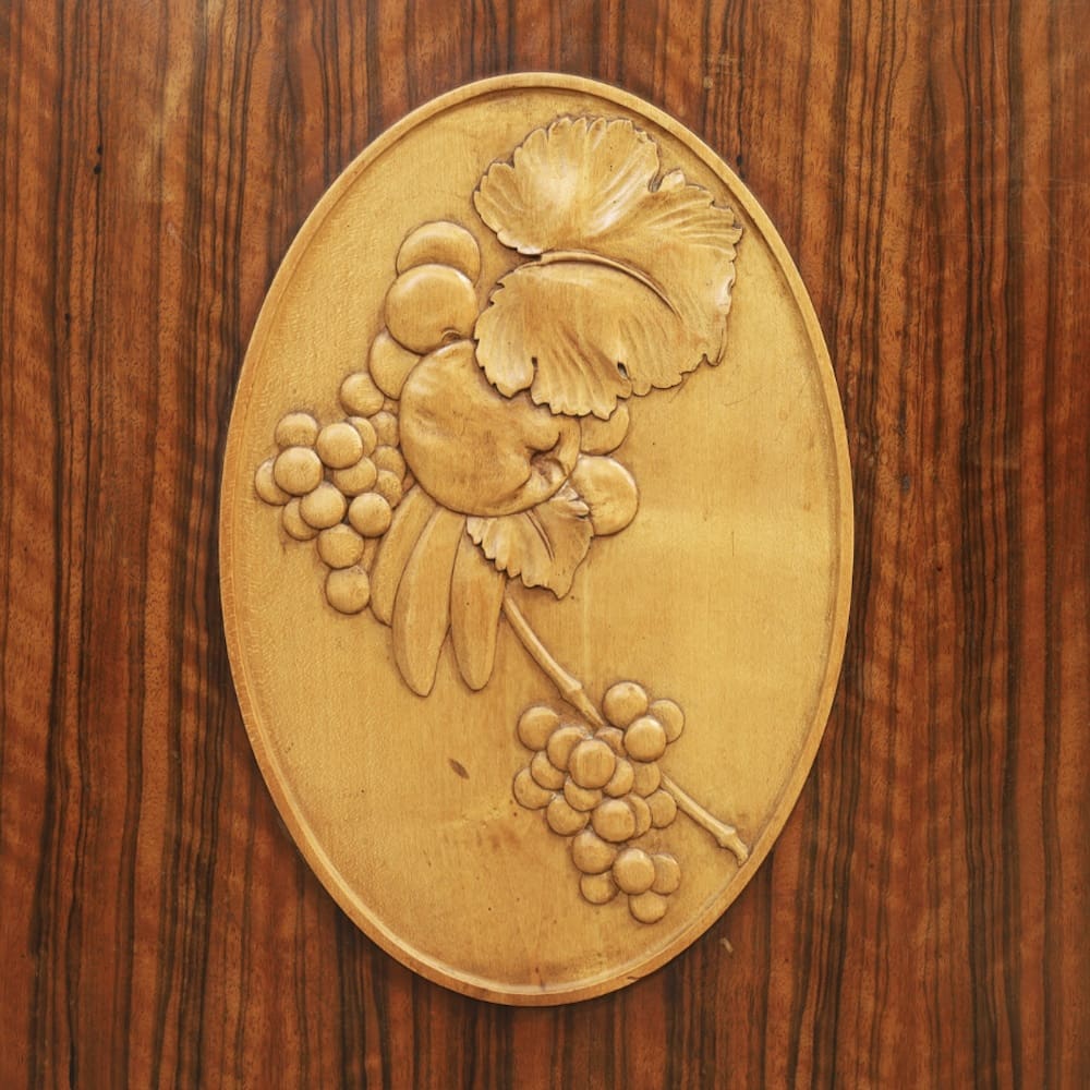 The central sycamore panel is carved with stylised fruit detail.