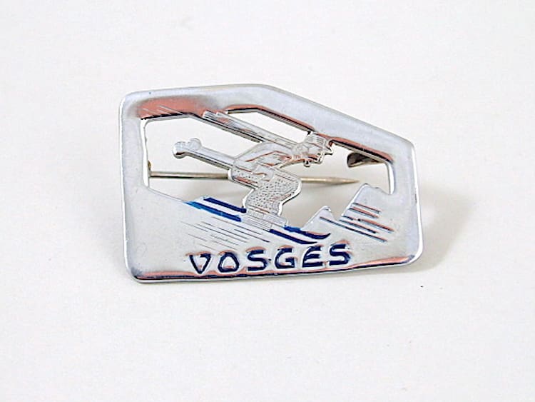 French art deco stylised chrome and blue enamel skier brooch. A souvenir from the French mountain range visited by skiers.