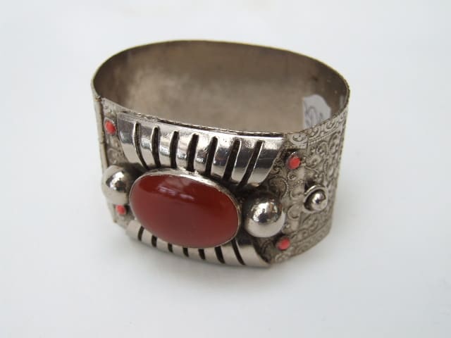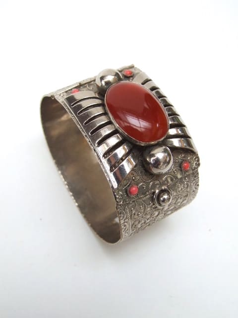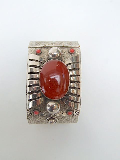 Vintage filigree silver metal slave bangle with amber and pink galalith stones. Opens and shuts by squeezing the sides to release the button catch.