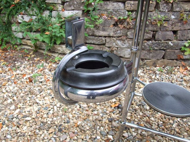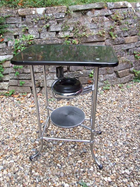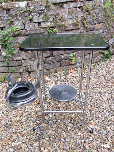 Made by the Belgian company, Demeyere who have been making modernist metalware items since 1909. This modernist chrome and black metal smokers table has a swing out bakelite ashtray arm and central pot or statue holder shelf.