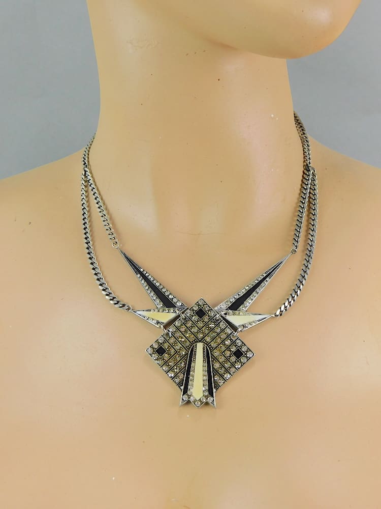 Black and cream enamel and rhinestone large star necklace. Made by Pierre Bex in Paris.