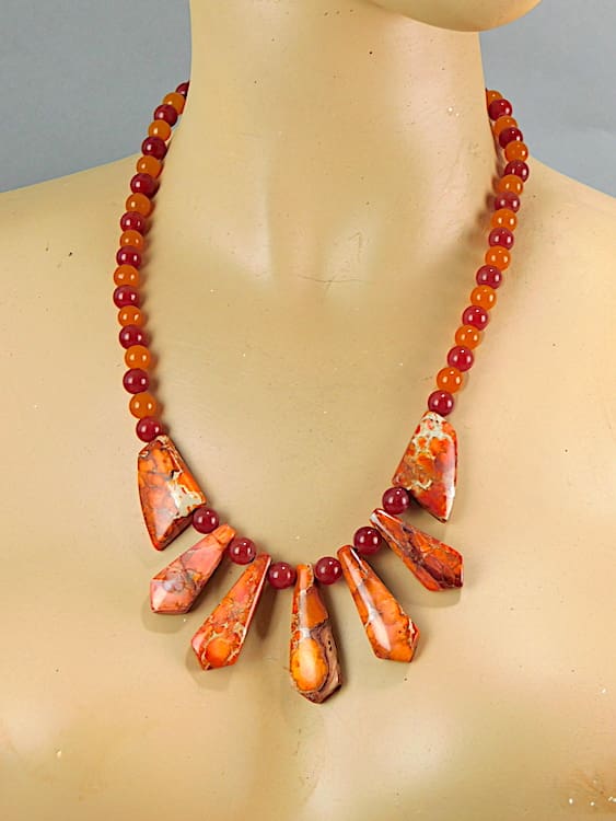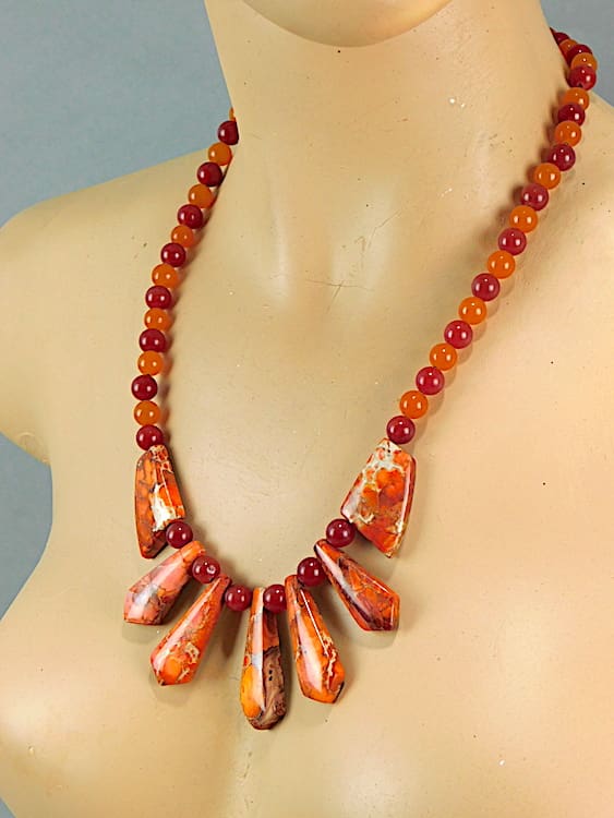Phenolic beads necklace with central fan soon e detail that I believe is possibly brecciated jasper.