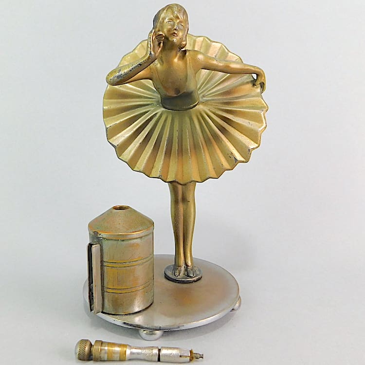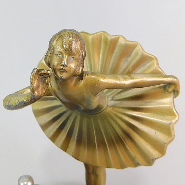 Austrian spelter striker with a saucy dancer, designed by Stephan Dakon.