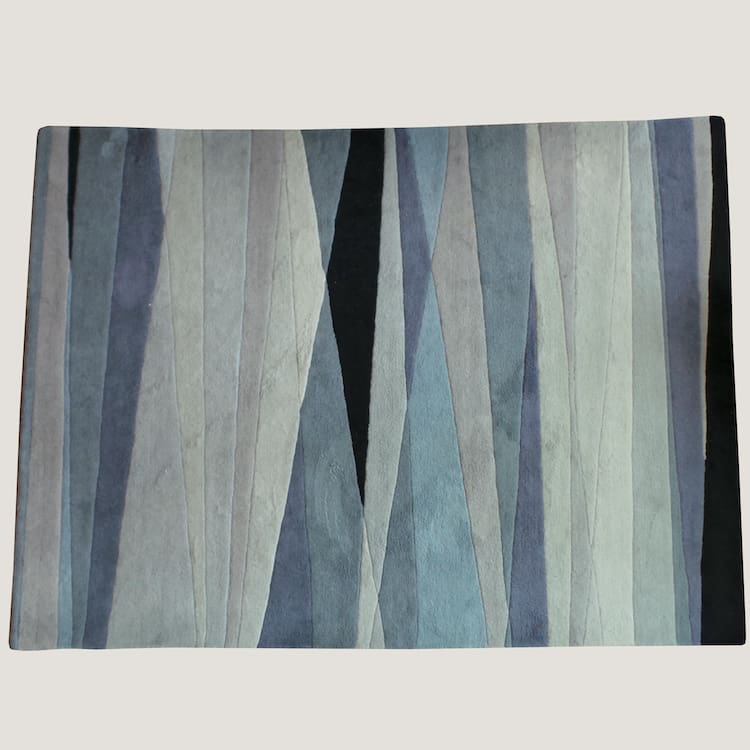 A 100% wool art deco style rug in shades of blue and grey.