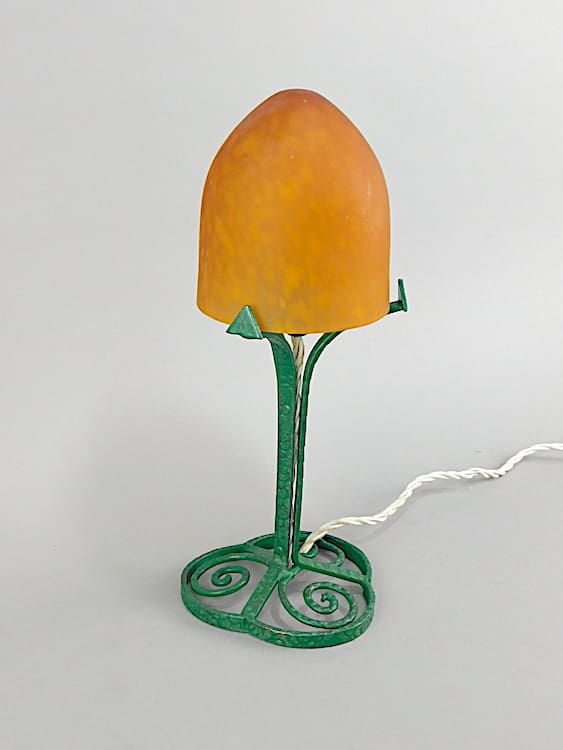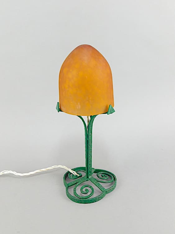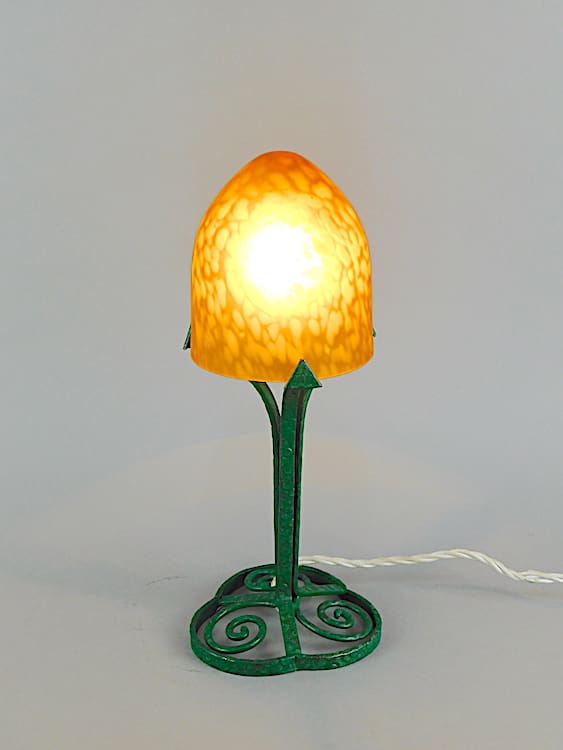 A green patinated wrought iron table lamp with orange mottled glass dome shade and rewired.