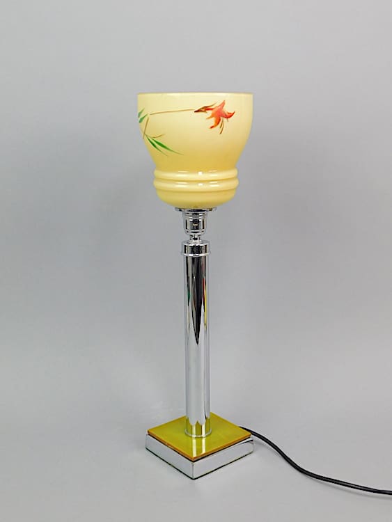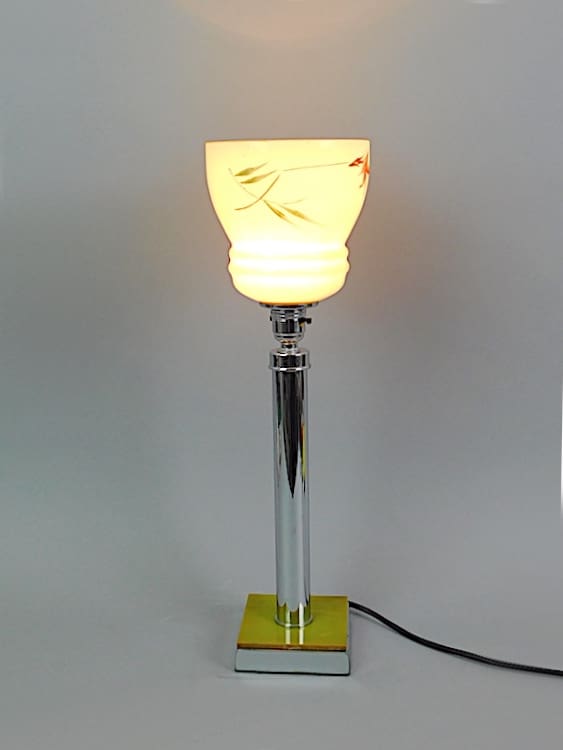 English art deco chrome and green phenolic table lamp with Czechoslovakian hand painted floral shade.