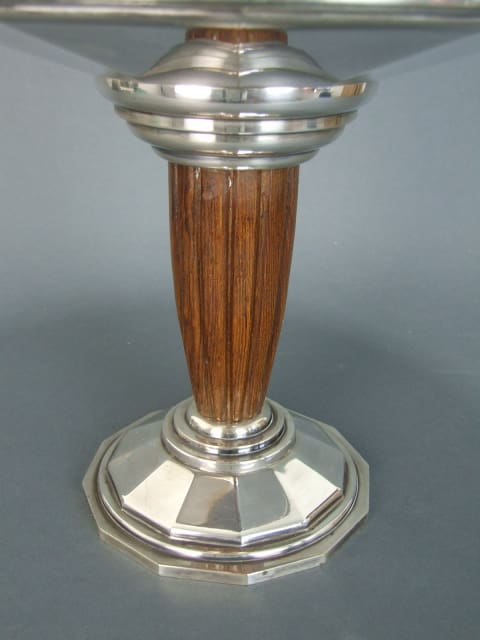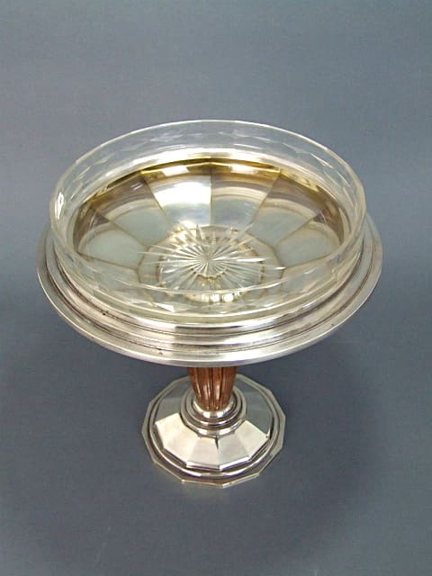 A superior quality silver plated glass and rosewood tazza or fruit bowl bearing the makers marks and stamps for Ravinet and Denfert. Complete with its original bevelled and etched glass insert.