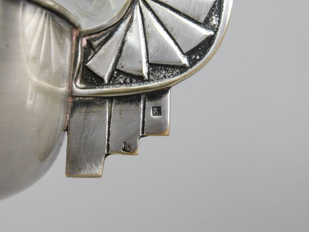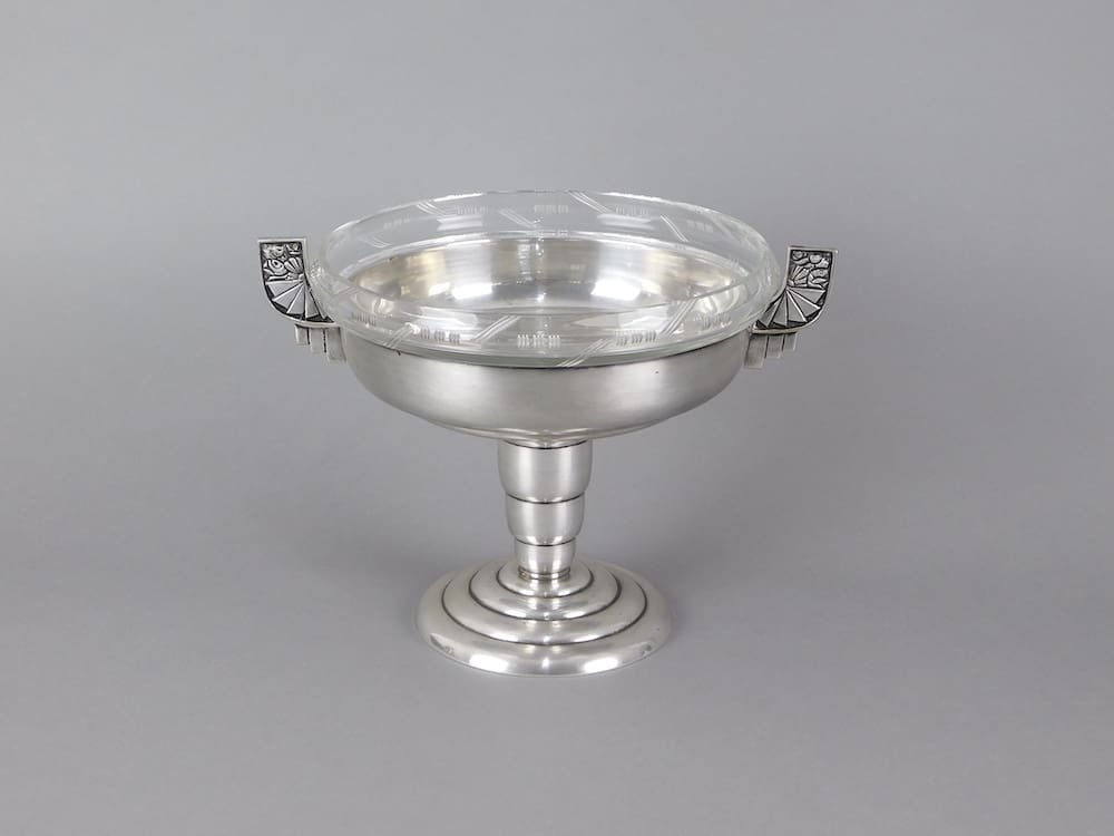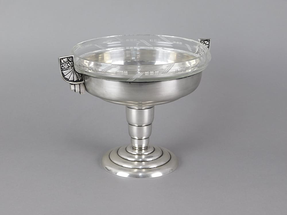 Modernist silver plated art deco tazza from Germany. It bears hallmarks or makers marks to a handle but indistinct. The bowl has its original glass insert with etched edge detail.