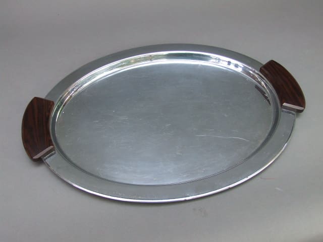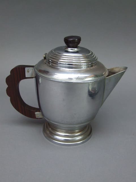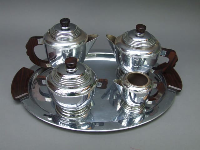 French chrome and macassar ebony handled five piece tea set.