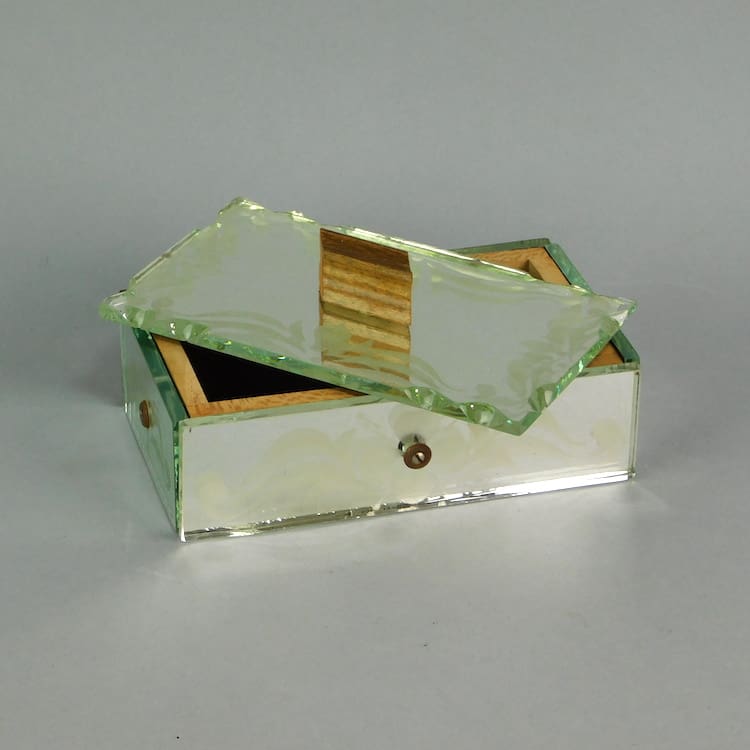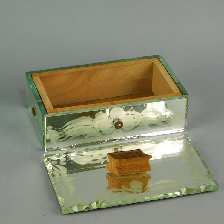Mirrored glass outer plates decorated with birds and bevelled edge design.