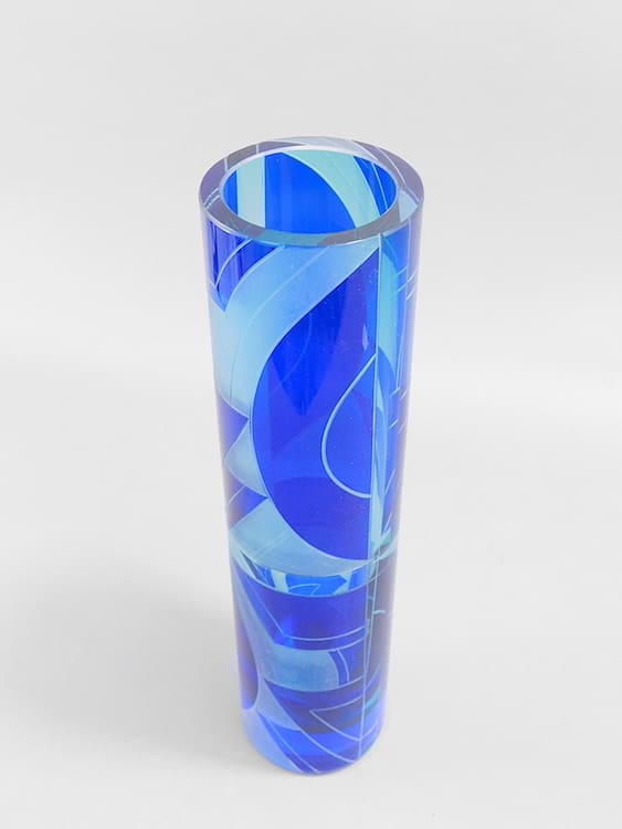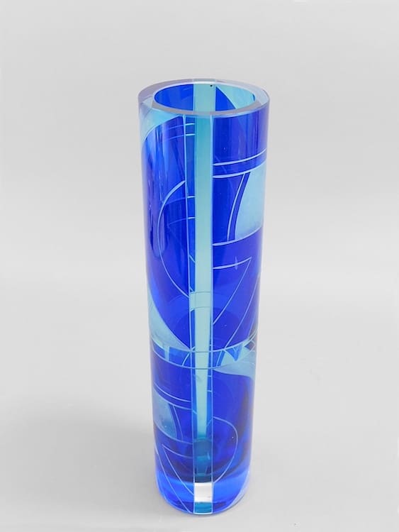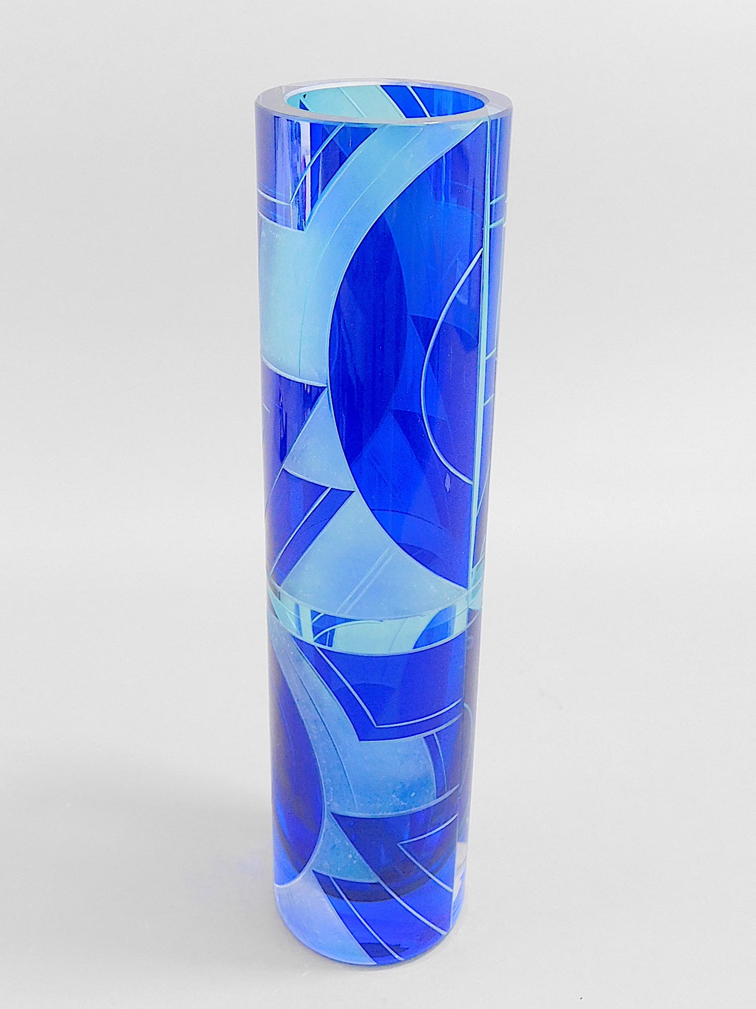Blue tubular thick glass vase, with enamelled and etched glass design by Karel Palda.