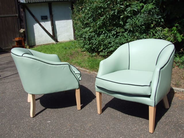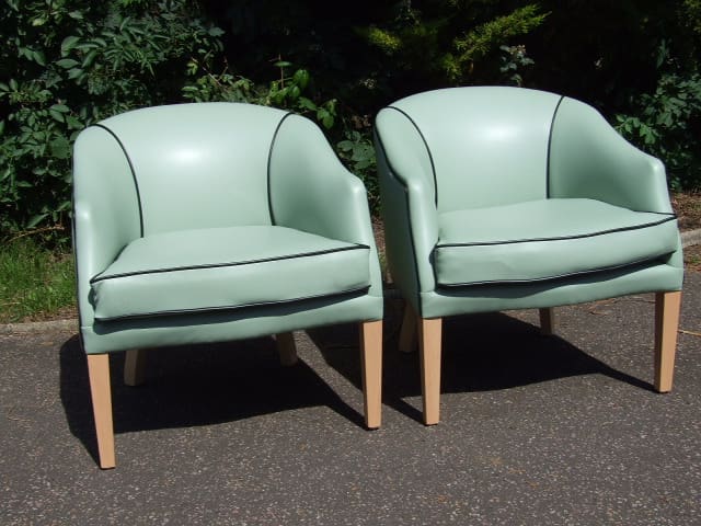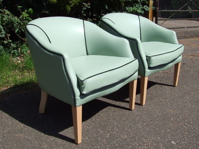 Pair of custom made art deco Waldorf chairs, trimmed in top quality hide in mint with a black piping with blonde wood legs.