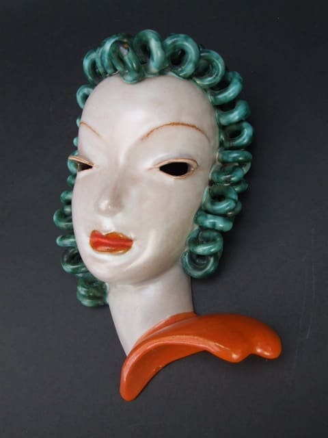 This is the famous sausage curl wall mask by Goldscheider. I believe there were three sizes made and this is the largest. Produced in the early 1930’s and marked to the back Goldscheider Wien, made in Austria and model number 6427.