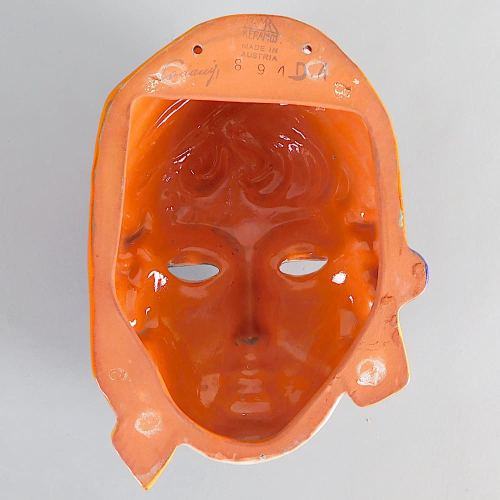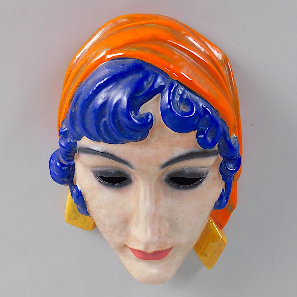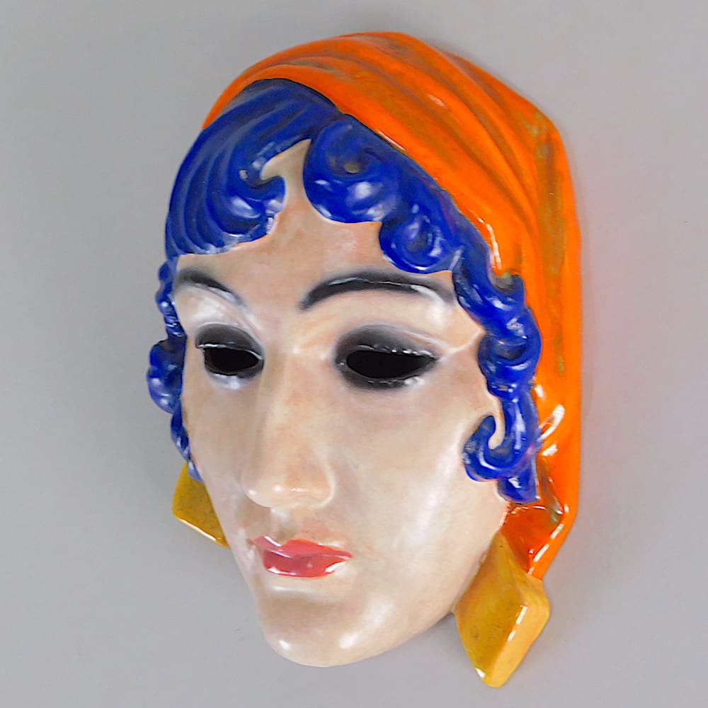 Hand painted art deco ceramic wall mask by Rudolf Podany.