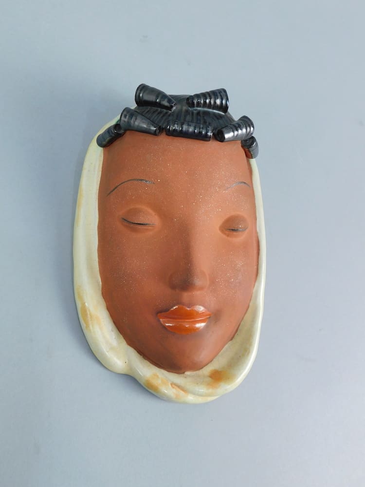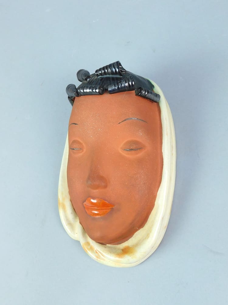 Czechoslovakian art deco terracotta wall mask with Goldscheider type scroll curls. Marked Czechoslovakia to the reverse.
