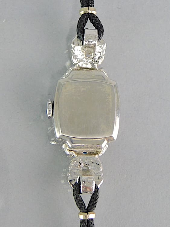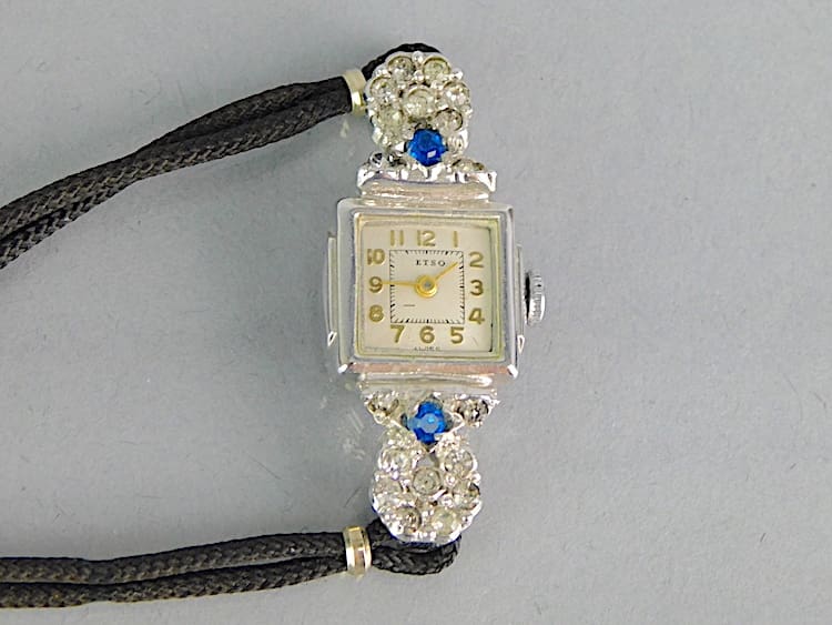 Womans watch with diamonte and blue glass stone detail. Leather thong strap that will fit a small wrist. I have had it working but obviously cannot guarantee a watch that is 100 years old.