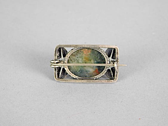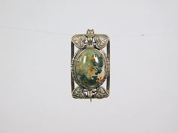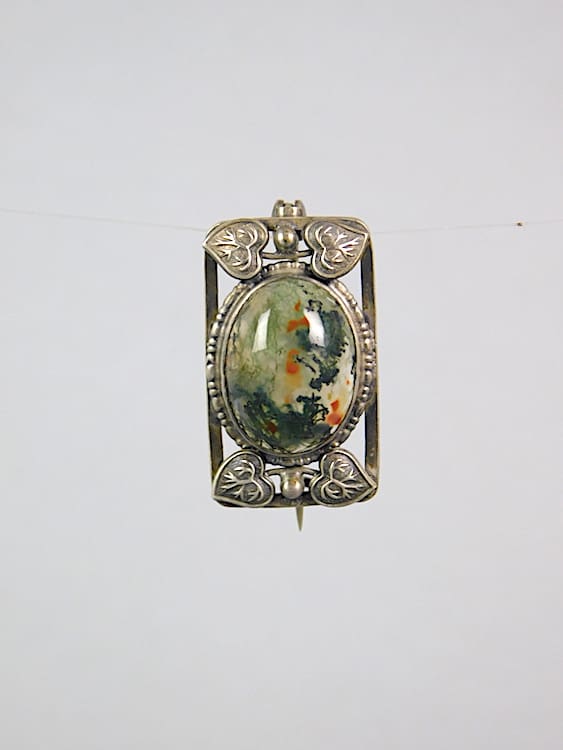 This is a delightful silver brooch with green agate stone to centre, surrounded by foliage and dating from about 1910.