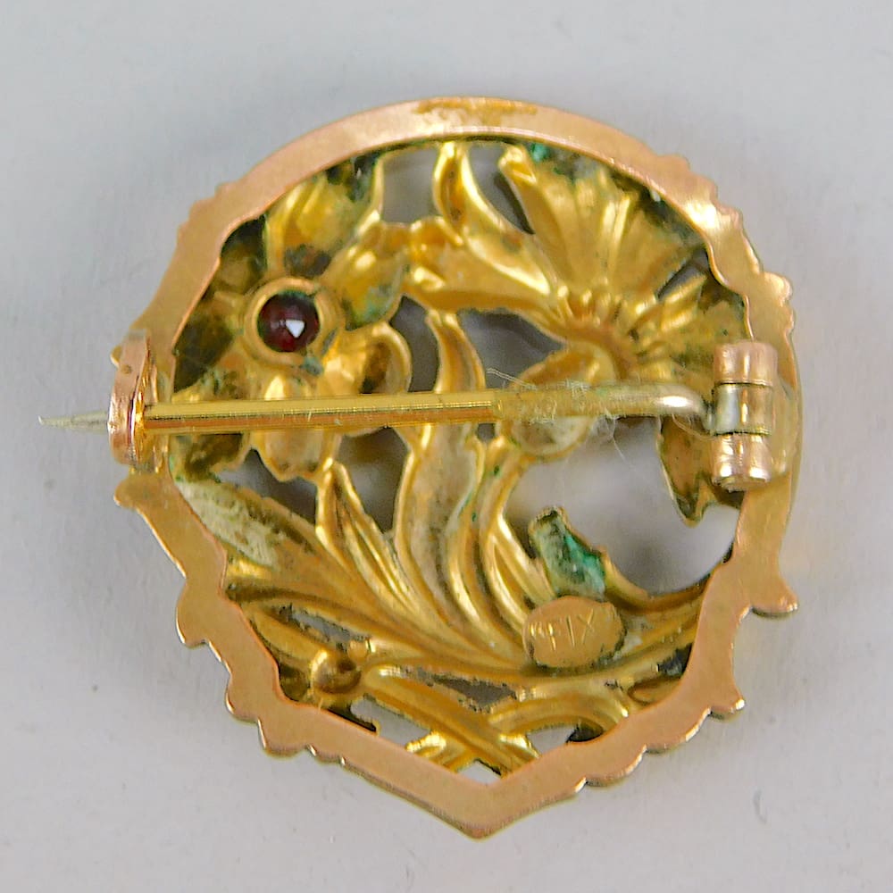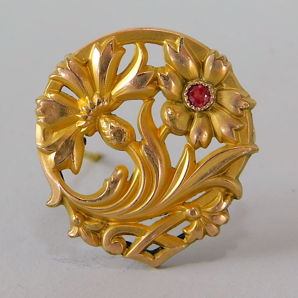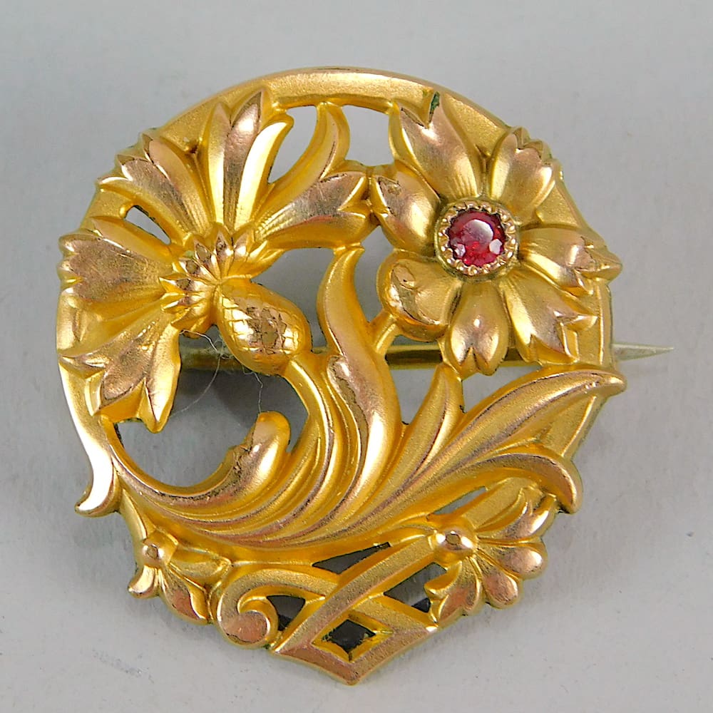 Pretty little brooch with stylised flowers, foliage and a pink stone.