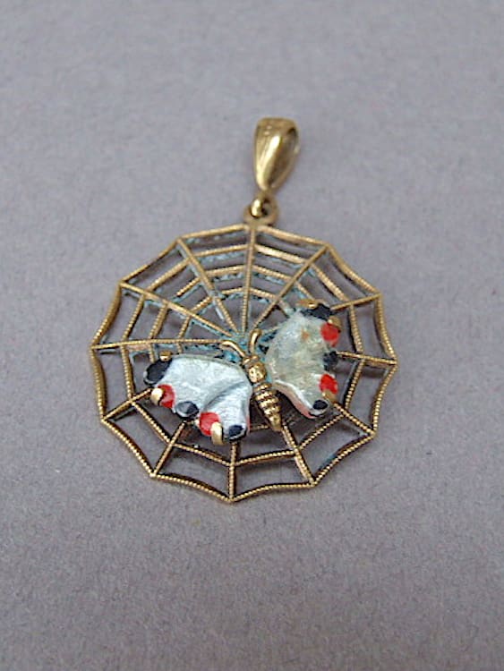 Gilt metal enamel butterfly on a web pendant, comes with a new gilt chain (not shown).