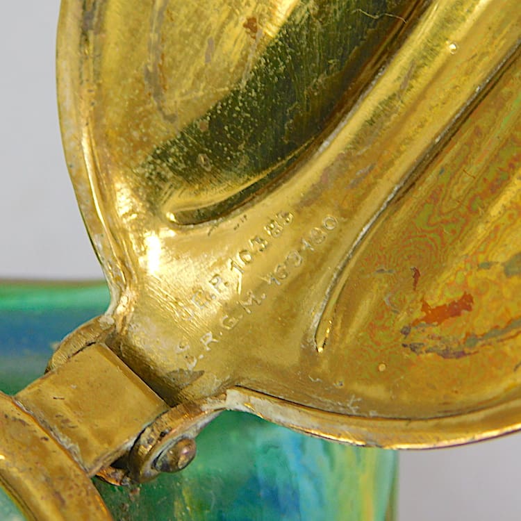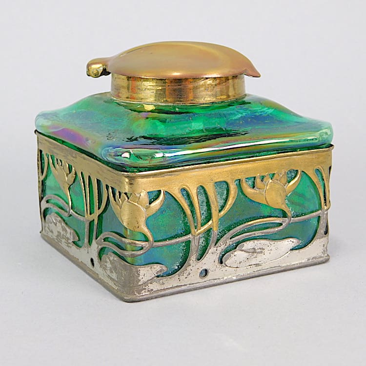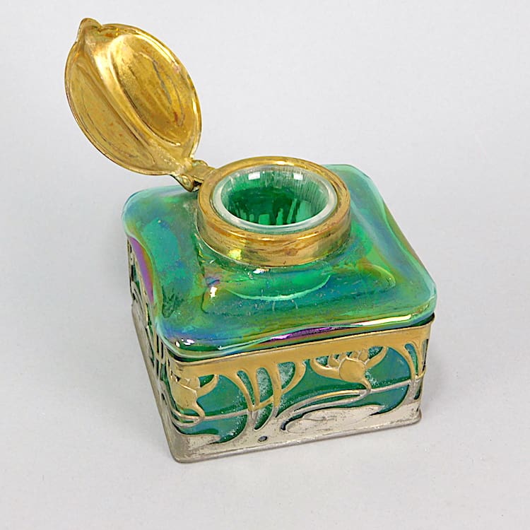 A green glass art nouveau ink pot with a brass lid. Areas of the brass surround around the glass is worn down to the metal. Stamped with numbers on the underside of the lid but cannot quite make them out.