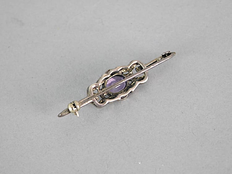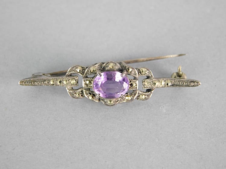 Lovely marcasite and amethyst glass brooch. No silver marking, but it is silver.
