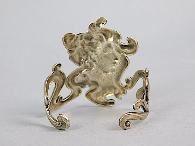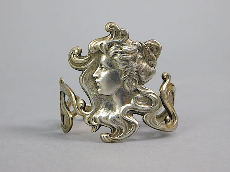 A more recent art nouveau style bangle of a maiden with whiplash design.