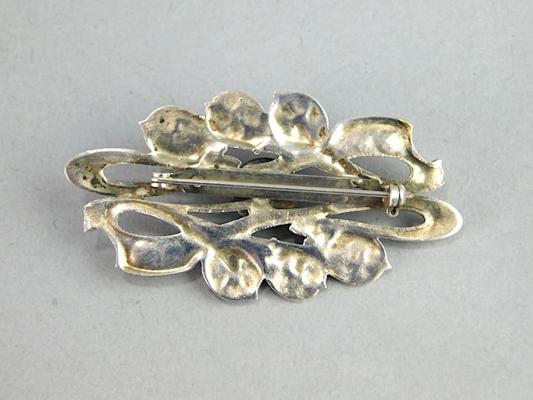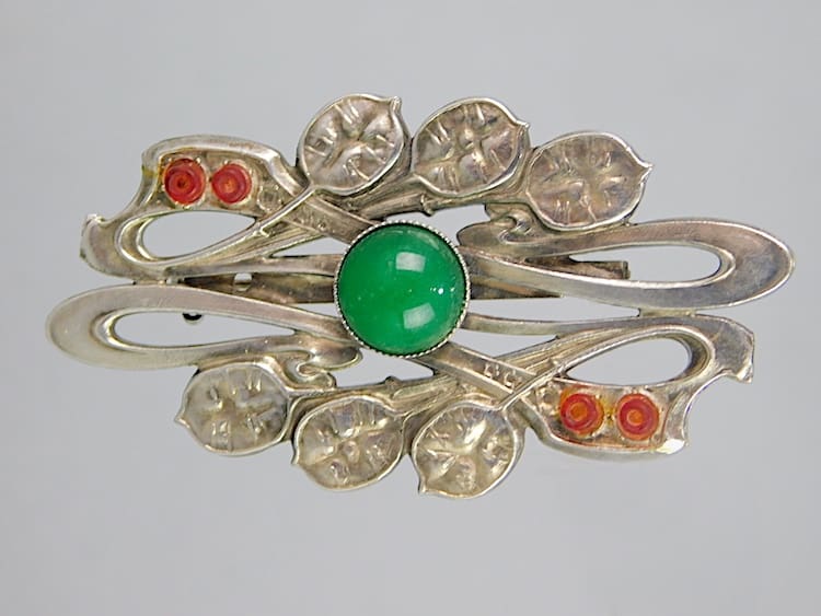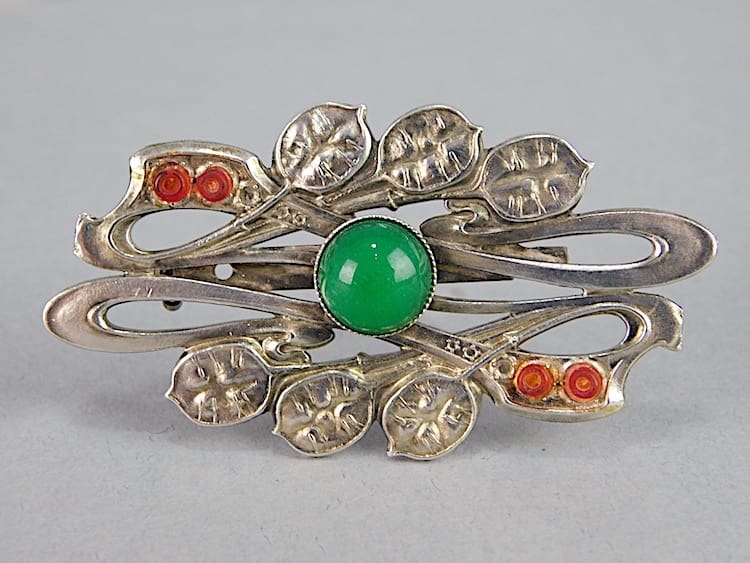 A modern reproduction art nouveau brooch with honesty foliage and green glass cabochon.