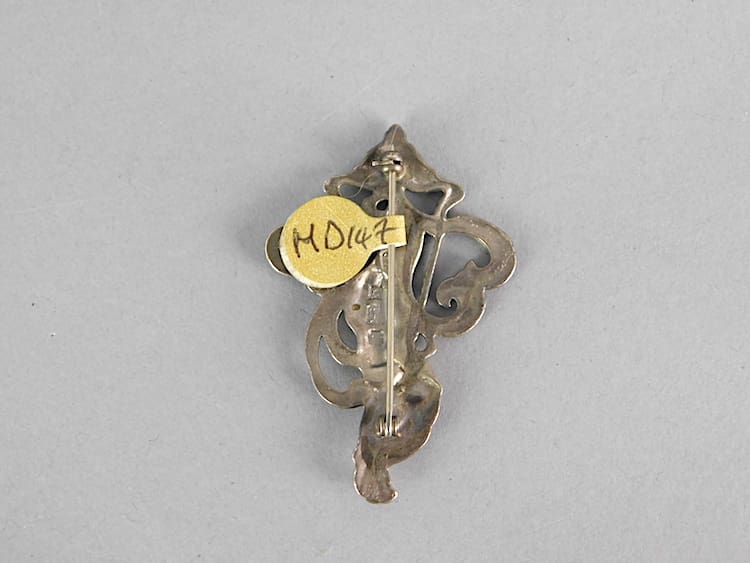 Contemporary brooch in the art nouveau style of a lady standing with whiplash foliage around her.