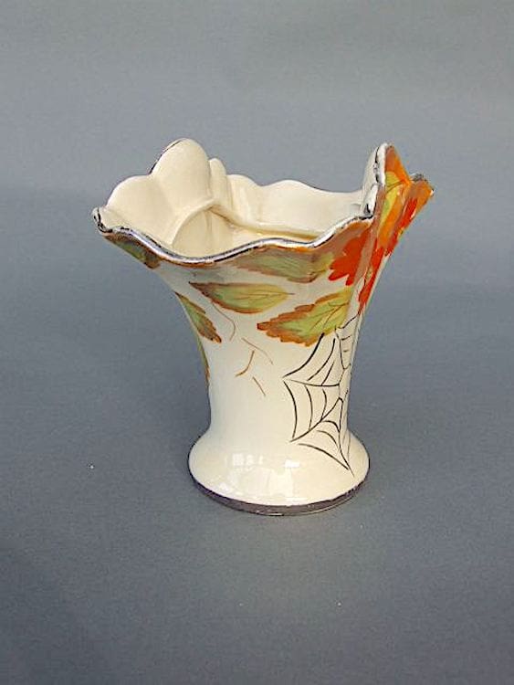A 1930’s hand painted vase with silver spider’s web detail and other silver detail. Possibly missing its posy frog.