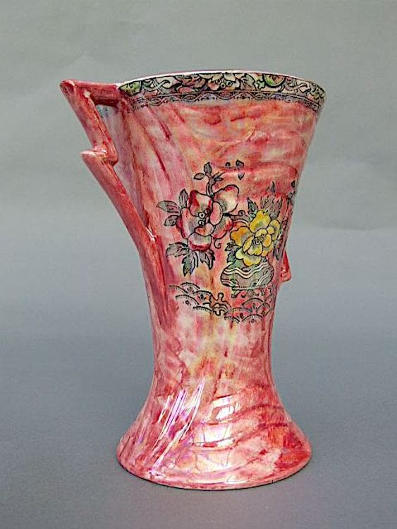 Astoria pink Lustreware vase by Royal Bradwell with lightening handle.