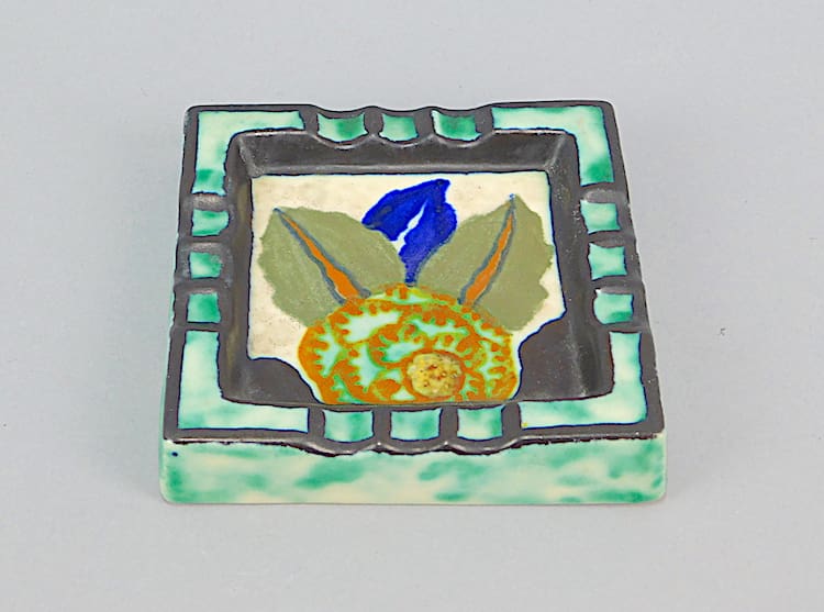 Lovely earthenware ashtray with matt hand painting of stylised flowers, very much in the style of Louis Dage, but this one signed D’Argyl underneath.