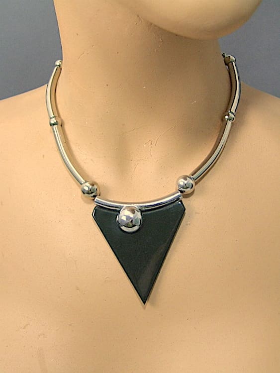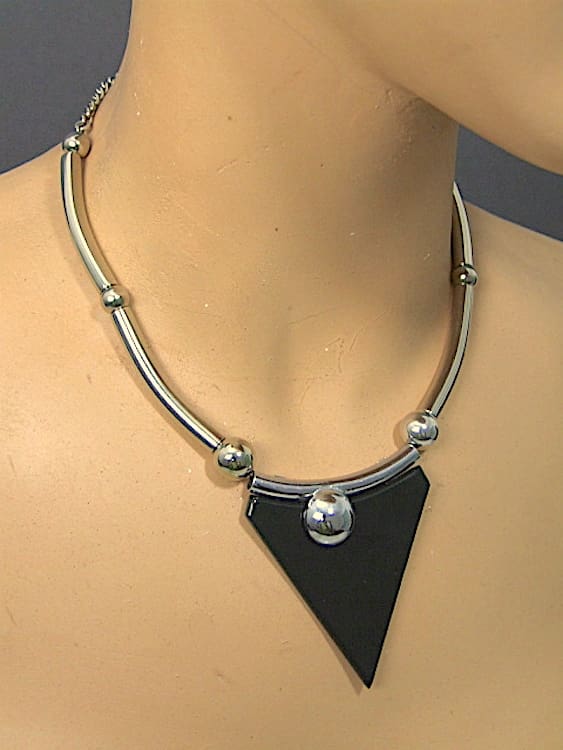 Black galalith necklace with asymmetrical chrome circle and chrome rods chain.