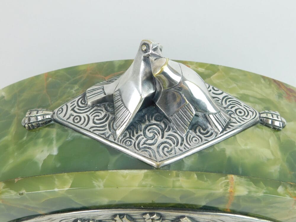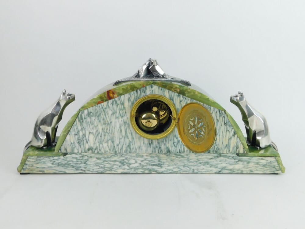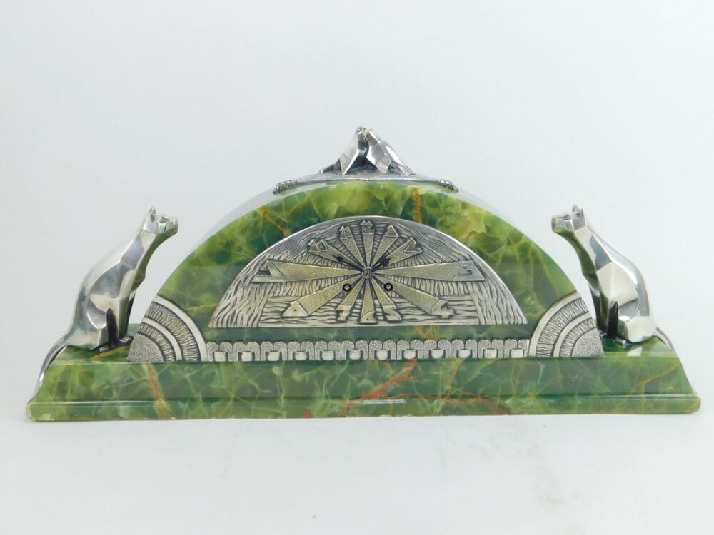 The clock case is Brazilian onyx and the face and detailing is silvered bronze.