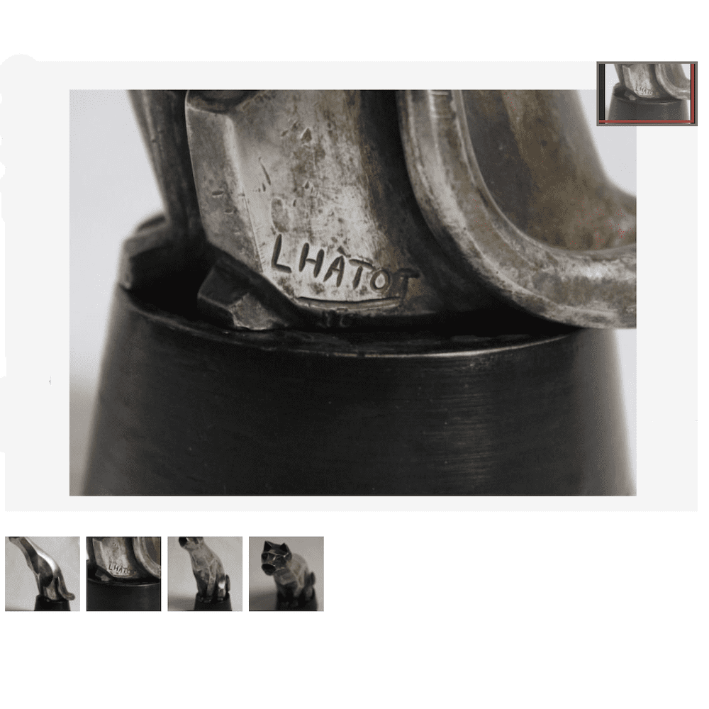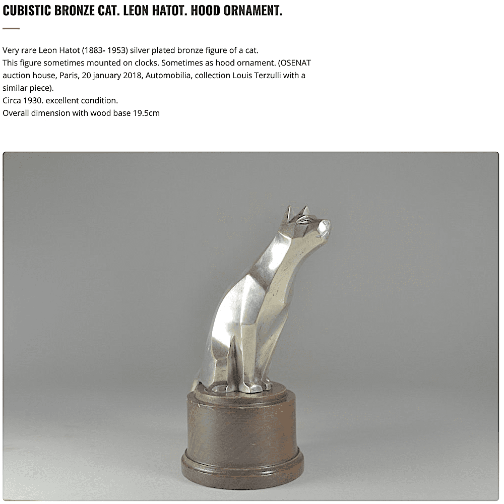 Additional pictures show that the cat is also sold as a car mascot/hood ornament and is signed to the bronze on the back of a leg.