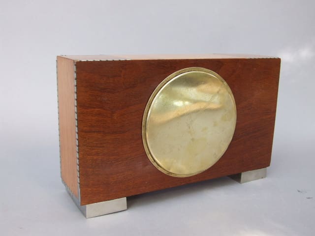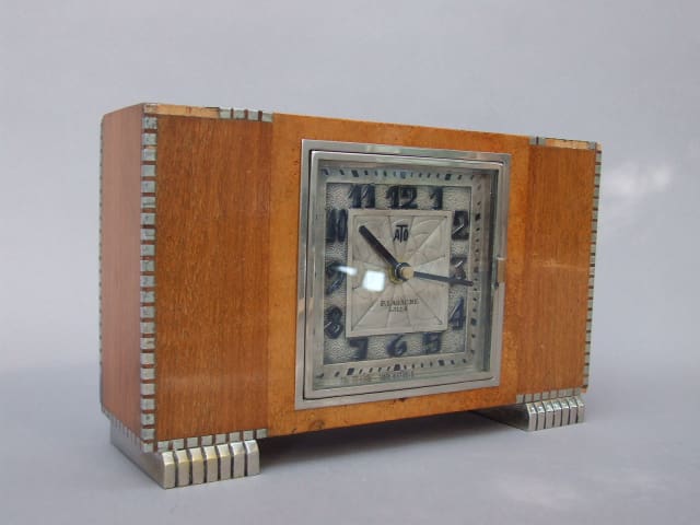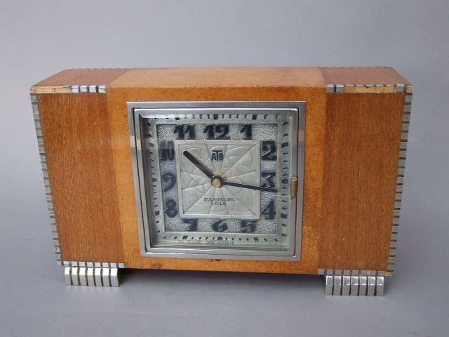 French wooden case with silvered bronze feet and marquetry around the edges. Sadly some of the small metal edge square are missing. The face of the clock is silvered bronze with the usual ATO spiders web patterning and deco numerals.