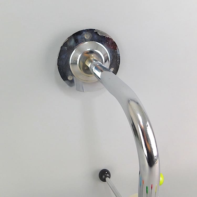 It is made of a chrome rod with a fixed egg shaped orb and 8 chrome rod arms with colourful wooden balls to the end to prevent coats slipping off.