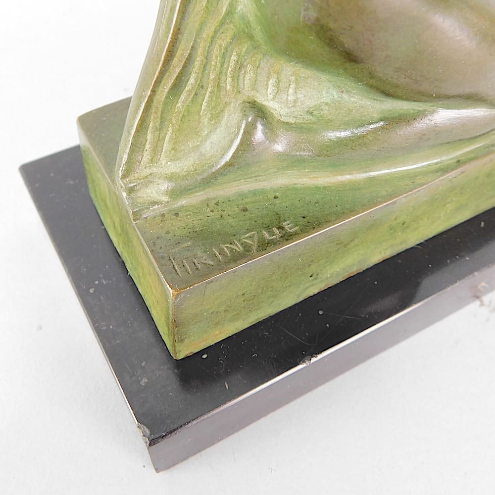 Small French art deco bronze bather statue by Trinque. Signed to the bronze base.