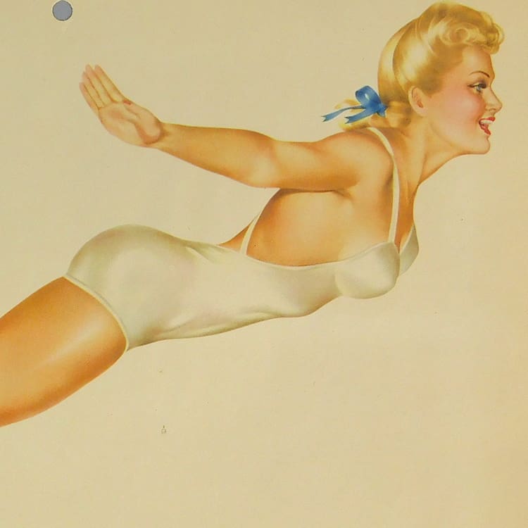 This is an original pin up girl from a vintage Esquire Girl calendar. Artwork by Alberto Varga with the printed signature to the bottom and verse by Earl Wilson.