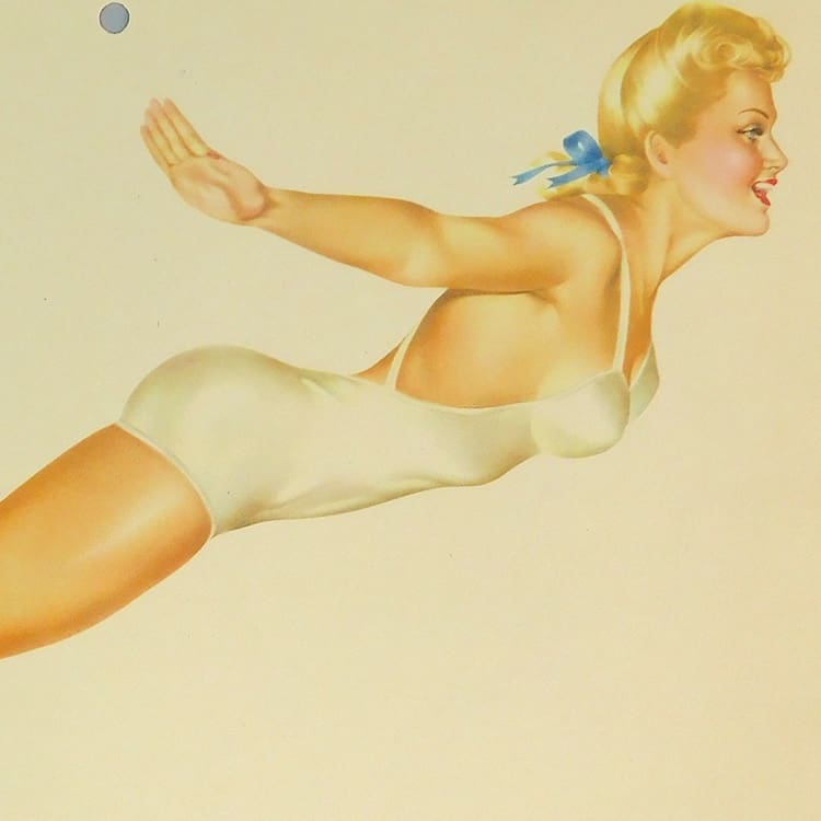 This is an original pin up girl from a vintage Esquire Girl calendar. Artwork by Alberto Varga with the printed signature to the bottom and verse by Earl Wilson.