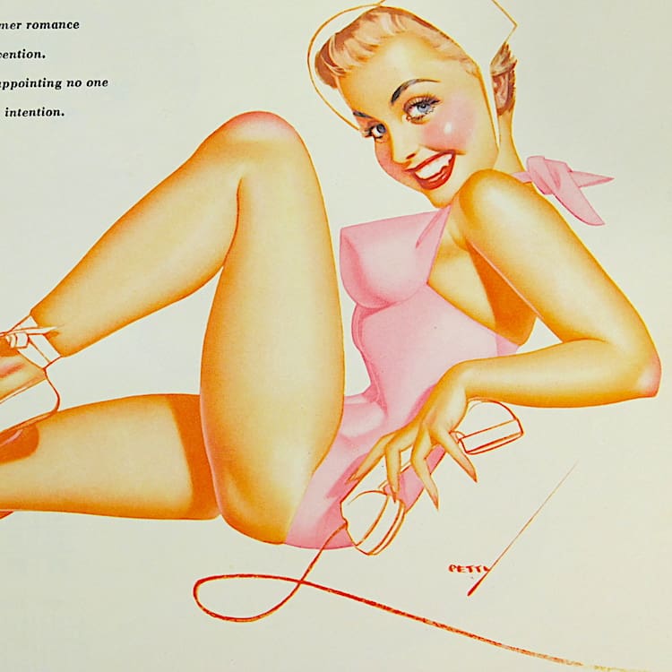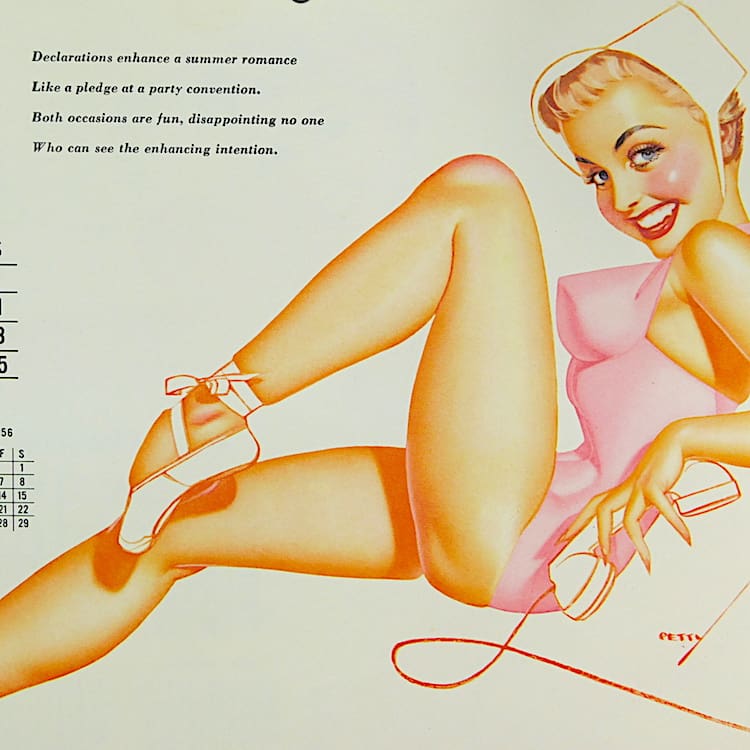 George Petty calendar girls page. Ideal for framing as a group as I have many Petty. Varga and other artists calendar girl pages. This one dates to 1956 and is August.