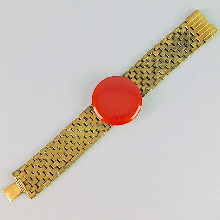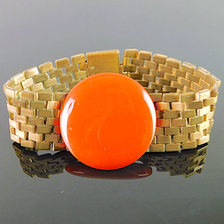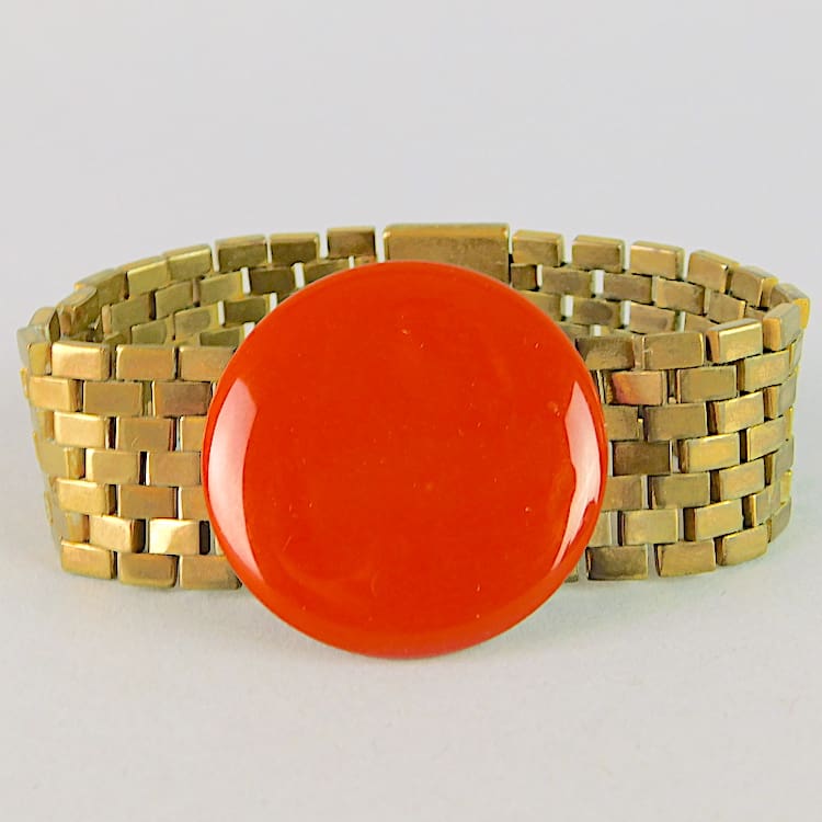 Chunky, heavy and good quality gilt metal brickwork bracelet with central russet red galalith disc. Stamped Austria to the clasp.