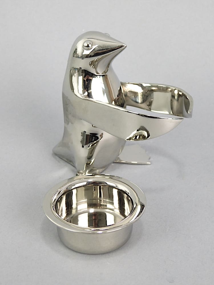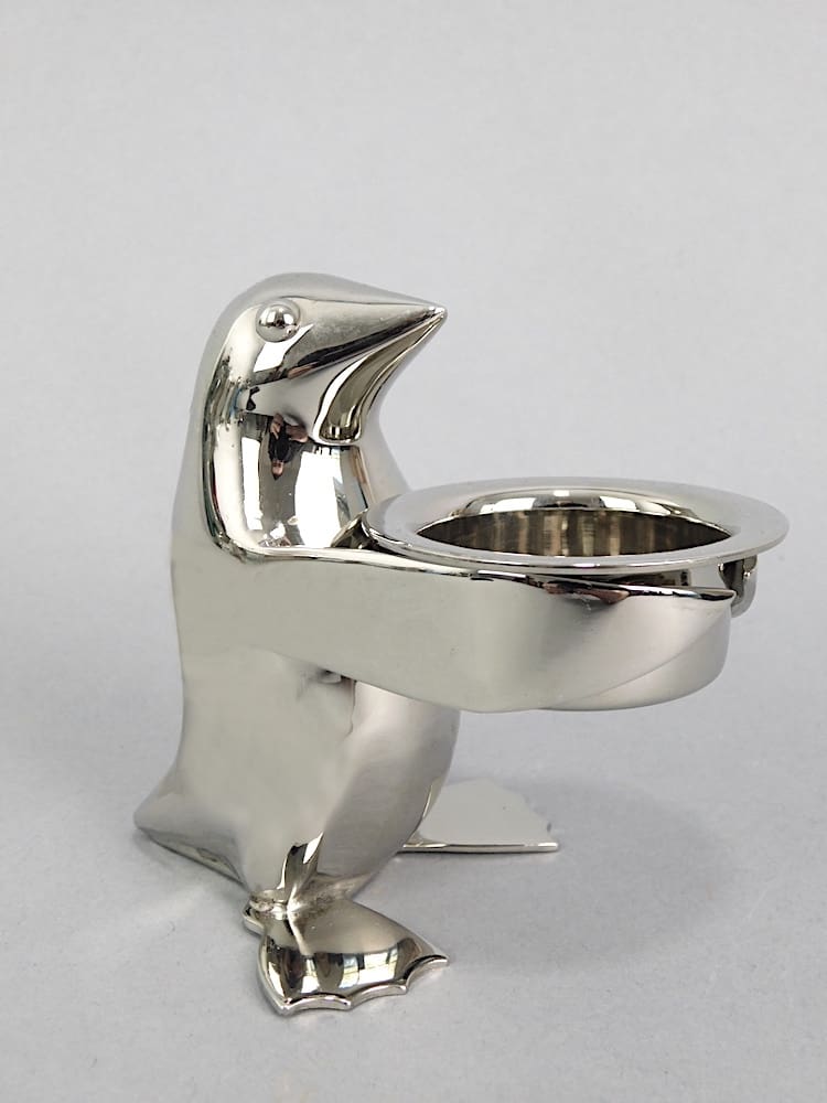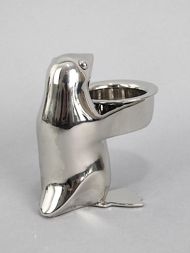 Silvered metal stylised penguin small dish holder. The dish will hold a tea light size or perhaps salt.