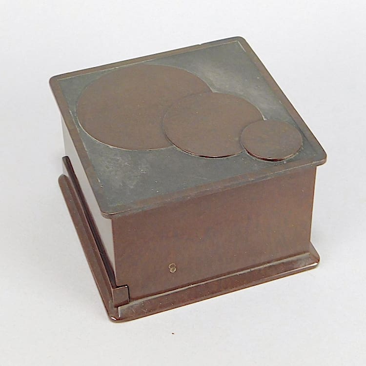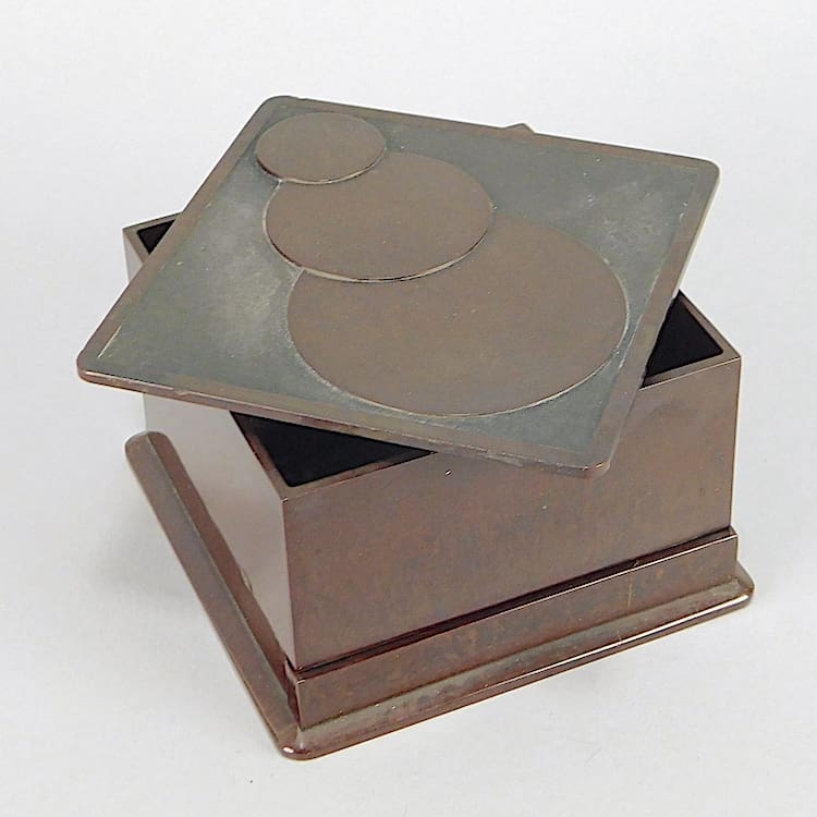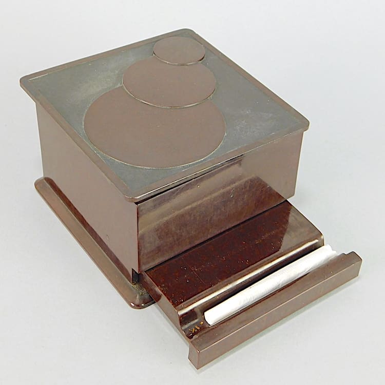 Brown bakelite art deco cigarette box. It has a pull out drawer to the front with an aperture for cigarettes.
